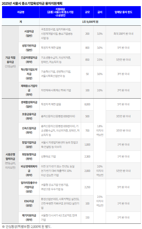 서울시는 2025년에 소상공인들을 대상으로 각기 다른 지원 항목을 두고 자금을 지원할 예정입니다. 지원 규모는 다음과 같습니다: