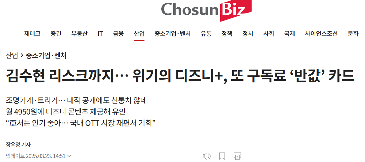 https://biz.chosun.com/industry/business-venture/2025/03/23/I2EY65CHHFCF3NGNRKDA2TYVVI/?utm_source=naver&utm_medium=original&utm_campaign=biz>> '디즈니 플러스' 구독료 반값