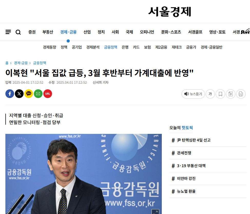 https://www.sedaily.com/NewsView/2GRCQXZU2N>> 이복현 금융감독원장 " 4월 가계부채 관리에 만전 "