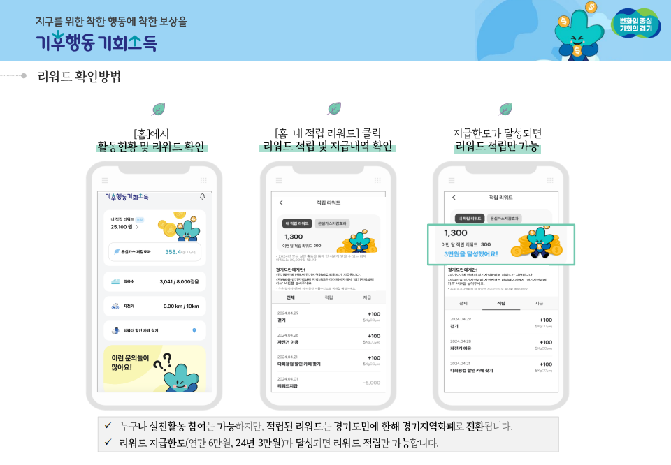 지구를 사랑하는 누구나 온실가스 저감을 위한 실천활동은 가능하지만, 적립된 기후행동 기회소득 리워드는 경기지역화폐로 전환됩니다. 서비스 이용에 착오 없으시기 바랍니다. *지급된 지역