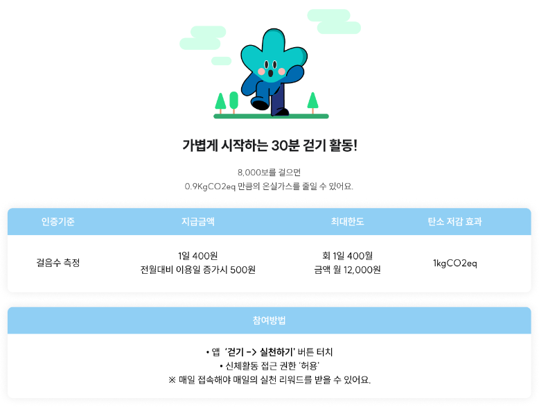 걷기는 가장 기본적인 기후 행동 중 하나입니다. 하루 8,000보를 걸으면 400P를 적립할 수 있으며, 월 최대 12,000P까지 적립할 수 있습니다. 이 활동은 매우 간단하고, 걷는 것이 건강에도 좋기 때문에 일상에서 쉽게 실천할 수 있습니다.