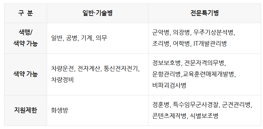 - 신체조건: 공군은 특기 분류 시 색약(색맹)자가 특정 특기 배정에 제한이 있을 수 있으므로, 공군의 특기 분류 세부사항을 미리 확인하는 것이 중요합니다.