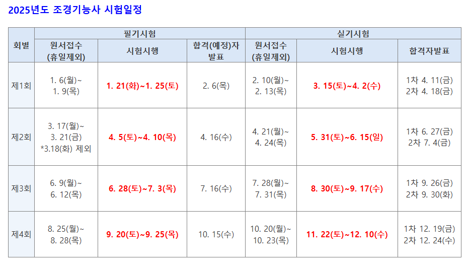 조경기능사 시험은 매년 4회 진행됩니다. 2025년 시험 일정은 다음과 같습니다: