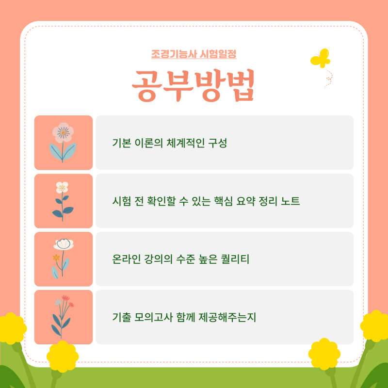 조경기능사 시험을 준비하는 방법은 여러 가지가 있습니다. 특히 문제집을 풀면서 실력을 쌓는 방법이 효과적입니다. 많은 학원에서는 교재를 구매하면 무상으로 강의를 제공하는 경우도 있기 때문에, 비전공자나 처음 도전하는 사람에게 유익한 기회가 될 수 있습니다. 강의는 기초부터 시작해 시험에 맞춰 체계적으로 진행되므로, 기초부터 차근차근 공부할 수 있습니다.